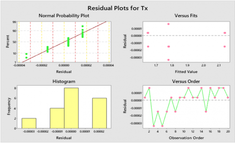 Under the quantified conditions, statistical investigation was carried out with 20 runs for Tx. Tables 5 and 6 present the coded coefficients and the effects of the statistical evaluation. The model is suitable for predicting Tx, as it achieved an R² value of 100% through the applied statistical approach. Additionally, the adjusted R² for Tx is 100%, slightly lower than R², yet the model still provides an acceptable fit to the experimental data.