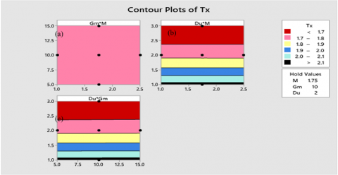Figure 21. (a) Consequence of Gm and M on Tx, (b) Consequence of M and Du on Tx, and (c) Impact of Gm and Du on Tx