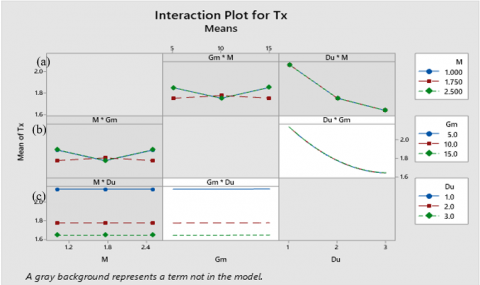 $\begin{aligned} & \mathrm{Tx}=2.72465-0.000067 M+0.000155 \mathrm{Gm}-0.704125 \mathrm{Du} \\ & +0.000001 \mathrm{Gm}^* \mathrm{Gm}+0.114431 \mathrm{Du} * \mathrm{Du}+0.000020 \mathrm{Gm}^* \mathrm{Du}\end{aligned}$