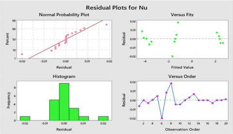 Under the specified conditions, statistical analysis was performed with 20 turns for Nu. Tables 7 with 8 present the oblique coefficients in addition the effects of the statistical evaluation. The model is appropriate for predicting Nu, achieving an R² value of 100% through the applied statistical method. Additionally, the adjusted R² for Nu is 100%, slightly lower than R², yet the model still provides an acceptable fit to the experimental data.