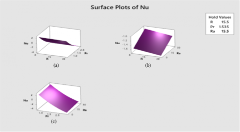 Figure 25(a) demonstrates the significance of Pr and R on response function. It achieved supreme value for the nominal value Pr and R Figures 25(b), (c) explained the influence of of Ra and R on answer function. The maximum value of the response function is experiential at short value of Pr and Ra and all values of Nu.