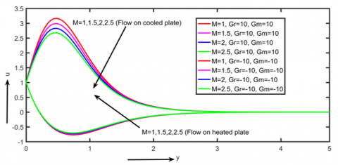 Figures 2 and 3 show that as the magnetic field parameter is increased, the primary and secondary velocity fields through cooled plates decrease, and the opposite effect occurs in heated plates. The reason for this is that the introduction of a transverse magnetic field will produce a Lorentz force, which is a resistive force that acts like a drag force and seeks to impede fluid flow, hence decreasing fluid velocity.