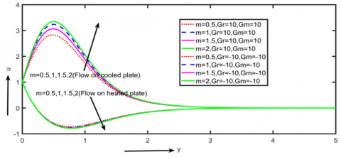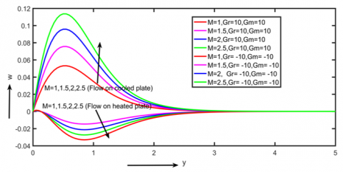 The impact of Hall current on primary and secondary velocities (u, w), as depicted in Figures 6 and 7. It is clear from Figures 5 and 6 that the primary velocity "u" grows at increasing "m" around the boundary layer field, while the secondary velocity w decreases with increasing "m" throughout the boundary layer area on the cooled plate and also has the opposite effect on the heated plate. Given that Hall current creates secondary flow in the flow-field and has the opposite effect on primary fluid velocity throughout the boundary layer region, it follows that Hall current tends to accelerate primary fluid velocity throughout the boundary layer region.