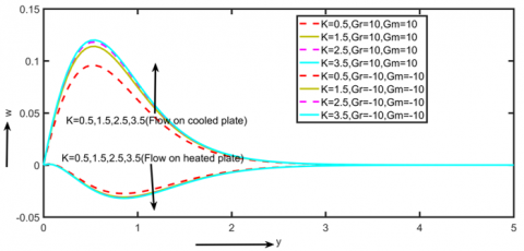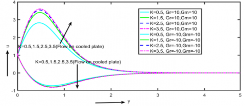 It is evident from Figures 4 and 5 that increasing K values cause a rise in primary and secondary velocities. In terms of physics, an increase in K tends to reduce the porous medium's resistance, which increases the fluid's velocity across cooled plates and has the reverse effect on heated plates.