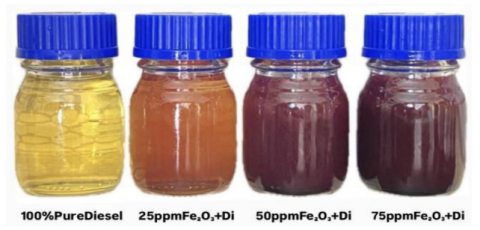 The usual procedure to stabilize the fuel additives in Nano-sized particles is ultra-sonication, which helps in evenly dispersing nanoparticles in fuel, besides increasing fuel blend stability. For this study, an ultrasonic bath having a power of 240W, a frequency of 40 KHz, and a temperature (temp) of 50℃ is used to mix nanoparticles in diesel fuel for at least 30-40 minutes. A slight aggregation of nanoparticles is observed after 48 hours. Re-homogenation of fuel for testing is facilitated by further subjecting fuel to ultrasonic waves for a period of an additional 15 minutes; this is ascertained by two ways, namely, visual verification of tests and further spectroscopic verification, which is strong confirmation of the readiness of the fuel samples for tests to proceed as scheduled. During the experiments, the engine was fueled with various mixtures: pure diesel (Di+25mg/L Fe₂O₃, Di+50mg/L Fe₂O₃, and Di+75mg/L Fe₂O₃) as shown in Figure 1. The specifications of the Nano-sized and Fe₂O₃ particles are provided in Table 1.