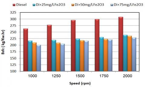 The inclusion of Nano-particles enhances the performance of the engine by increasing ($\eta$Bth) and reducing the amount of Bsfc since a high surface-to-volume ratio also lowers pollutant emissions and accelerates the rate of reactions. The accelerated combustion is a result of a shorter ignition delay compared with neat diesel [7, 8]. The combustion efficiency of diesel fuel is enhanced when Iron-oxide (Fe₂O₃) nanoparticles are combined with it, since their oxygen-rich molecular structure [9]. Enhancing combustion leads to reduced emissions of nitrogen oxides (NOx) and particulate matter compared with pure diesel engines. The added Fe₂O₃ also promotes a more homogeneous fuel–air mixture, which reduces incomplete combustion and enhances engine performance. Furthermore, the higher cetane number of these additives contributes to improving engine smooth operation and fuel efficiency [10, 11].