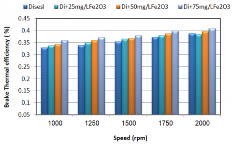 The mixing of pure diesel fuel with iron oxide Nano-Fe₂O₃ shown in Figure 6, significantly improved the thermal efficiency ($\eta$Bth). The results showed that at an amount of 75 mg/L, the $\eta$Bth reached 0.42% compared with 0.25% for pure diesel fuel at 2000 rpm, an improvement of 17.6%. This is because the role of the nanoparticles is as catalysts that accelerate the fuel oxidation rate and reduce the ignition delay time. They also enhance thermal conductivity within the combustion chamber, enhancing combustion completeness and reducing thermal energy Fe₂O₃ nanoparticles have the potential to improve combustion efficiency and reduce carbon deposits, and thereby enhance engine durability. Over time, these benefits may extend service life and lower maintenance costs [22].