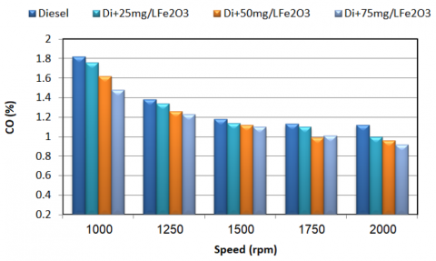 2. Carbon monoxide emissions decreased from 1.05% to 0.9% with the addition of 75 mg/L Fe₂O₃ to pure diesel, an improvement of approximately 14.3%, at 2000 rpm.