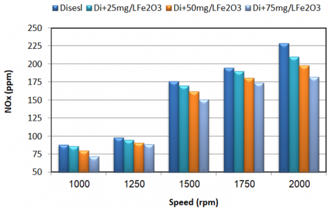 3. Increasing the mixing amount of the Nano-particles Fe2O3 (25-75 mg/L) by weight, an improvement of approximately 24.9% of NOx, and 14.4%. HC releases at 2000 rpm.