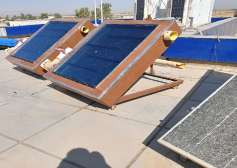 In order to reach the objectives of the research, two similar practical models were designed at a certain angle and in specific variable weather conditions to determine the efficiency of solar collectors. Solar collector model is given in Figure 1, and the models that are mounted on the top of the Renewable Energies Research Unit at the Hawija Technical Institute are given in Figure 2. It is 8 meters high and is situated in the north of Iraq, its location being 35.19 °N, 43.46 °E. The components of all the solar collector models include: