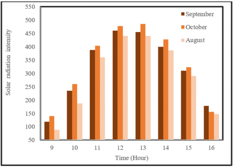 The strength of the solar radiation at the solar radiation at after 13:00 PM decreases in the afternoon, as can be seen in the downward movement of the curves. The values obtained at 16:00 PM fall to approximately 150 W/m2 in October, 175 W/m2 in September, and 145 W/m2 in August. Generally, the figure shows that the intensity of the solar radiation in October is greater in most areas of the day, which could have a positive impact on the performance and efficiency of the solar thermal systems that make use of the main source of energy, which is the solar radiation.