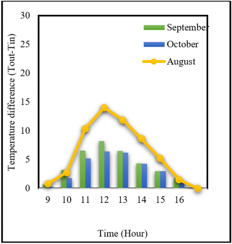The thermal performance of the system is shown in Figure 4 as the daily change in the temperature difference between the air outlet and inlet (Tout -Tin) between 9:00 AM and 16:00 PM in the months of August, September, and October. All months have low temperature differences, with August having about 1 ℃, then September (10 ℃) and October (10 ℃), which means that solar heating is still restricted at this early part of the day. A rise in the intensity of solar radiation towards midday increases (Tout-Tin) at a consistent rate, reaching its peak at a time around 12.00 PM in August, which has an ideal temperature difference of about 14 ℃, showing a high level of heat absorption and conversion in the air duct. Comparatively, the mean peak value is moderate at 8.2 ℃ in September and lowest in October at 6.5 ℃, which is explainable by the variation in ambient conditions and the angles of incidence of the sun. The difference in temperature decreases slowly in the afternoon after noon. At 14:00 PM, August continues to be more thermally efficient (about 12 ℃), but September and October fall down to about 6.5 ℃ and 6.2 ℃, respectively. At 16: 00, the disparities of temperatures of all months are unified to low values, 1.5 ℃ to 2 ℃, which is the cessation of the useful solar heating season. On the whole, this figure shows that the thermal performance of August is better, and the impact of climatic conditions and system design parameters on the efficiency of solar air heating systems is great.
