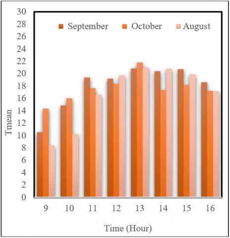 The warmer temperature occurs at 13.00 PM when the average temperature has its daily maximum, with October being the highest (around 22 ℃), slightly higher than August and September (around 21 ℃). This demonstrates that there was a performance edge in October when the solar conditions were at their peak. Subsequently, there is a slight decrease in the average temperatures in the afternoon. At 14:00 PM, October decreases more sharply to approximately 17.5℃, whereas August and September have much higher values (approximately 21 ℃ and 20.5 ℃, respectively). At 16:00 PM, the temperatures are once again united to about 17 ℃ or 18.5 ℃ for all months, which is the decrease in the level of the solar input at the end of the day. On the whole, Figure 5 indicates that seasonal climatic conditions, including ambient temperature, solar radiation intensity, and incidence angle, have an impact on the thermal behavior of the system. The fact that temperatures came together around the peak hours proves that the system performs well in the presence of high amounts of radiation, and the fact that the temperatures drop in the afternoon highlights the importance of material thermal properties in heat retention.
