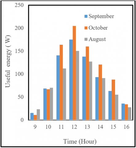 Figure 6 shows the useful energy harvested by the solar system at 9:00 AM to 16:00 PM in the months of August, September, and October, indicating how seasonal conditions impact thermal performance. The extracted power is usually low at all months, with August registering the highest (= 25 W), followed by September (= 15 W) and October (= 10 W), meaning that the thermal response is earlier in August in the morning hours.