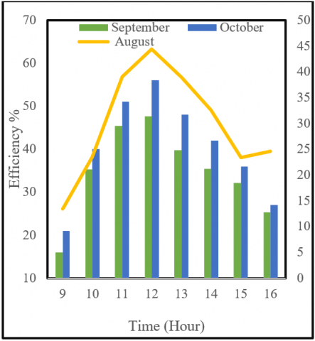 A stronger decline is also found during 15:00 PM, with the highest in August (approximately 24%), than in the months of September (approximately 32%) and October (approximately 36%). Lastly, the efficiency values approach 26-27% for all months at 16:00 PM meaning that the effective solar collection phase is over. In general, this number shows that the performance of October is always better, which proves the significant impact of the sun radiation intensity, environmental conditions, and thermal properties of the system.