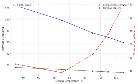 The bearing stiffness and damping coefficients are functions of oil temperature and operating conditions: