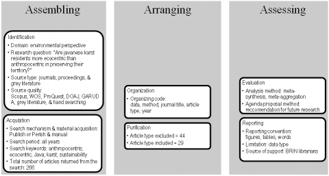 Based on PICO, we collected and stored all final articles in the database using the search “title, abstract, keywords” with the following keywords: karst; karst and Java; karst and sustainability; limestone and Java; limestone And Java and sustainability. The keywords: ecocentric, ecocentrism, biocentric, biocentrism, anthropocentric, and anthropocentrism did not match any findings. We considered the type of data (qualitative), type of study (qualitative and mixed methods), and language (English and Bahasa Indonesia) to filter articles. The initial search efforts yielded a total of 266 articles. The organization codes included data, method, journal title, article type, and year. This step resulted in 73 articles. Finally, after the refinement process, we included 29 articles and excluded 44 articles.