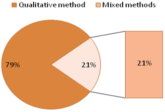 The findings of the review based on the predetermined organizing code provide an overview of the distribution of publications on the topic under study. The 29 final articles make full use of qualitative data, with a note that one article used quantified qualitative data [32]. As many as 79% of the methods used were qualitative studies and 21% used mixed methods (Figure 2). Mixed methods are not further described as complementary or concurrence.