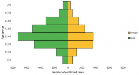 Lagos, Oyo, and FCT were the states with the highest number of cases while Cross River and Kogi states had the least number of cases. The case Fatality Ratio is 2% and the gender distribution shows that the infected persons are 65% male and 35% female. The gender distribution for infected cases are as reflected in Figure 2.