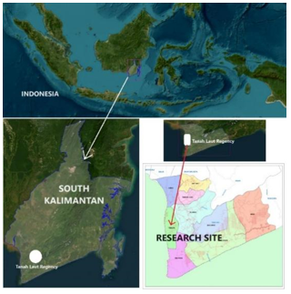 The study was performed in Tanah Laut District, South Kalimantan Province, Indonesia. Tanah Laut is located between 114°30'20″ - 115°23'31'' E and 3°30'33″ - 4°11'38'' S (Figure 1). The research location was chosen purposively considering that this area is the beef cattle business base, with a population reaching 50% of the cattle population in South Kalimantan [15]. Most of Tanah Laut's dryland is used for growing food crops, horticulture, plantations, and animal husbandry. Most Tanah Laut farmers have beef cattle that are managed independently or in groups to support agricultural businesses and sources of income [16]. There are 148,026 cows in South Kalimantan, with a potential productive female of 51,647 heads [17].