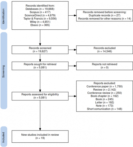 The selection of articles was carried out in groups of 2 authors independently, who reviewed a digital database to extract the information (authors, title, DOI or link, country where the research was conducted, measurement equipment, sound pressure level, festival where it was measured, points and period of monitoring), disagreements were resolved by all authors democratically following the eligibility criteria as well as choosing the articles that contained all the necessary information. The systematization of the article selection strategy was carried out using a digital tool that allows the production of the PRISMA 2020 flow chart [25]. At the beginning, 19668 articles were identified and with the application of the exclusion criteria, 19 articles remained for the review (Figure 1).