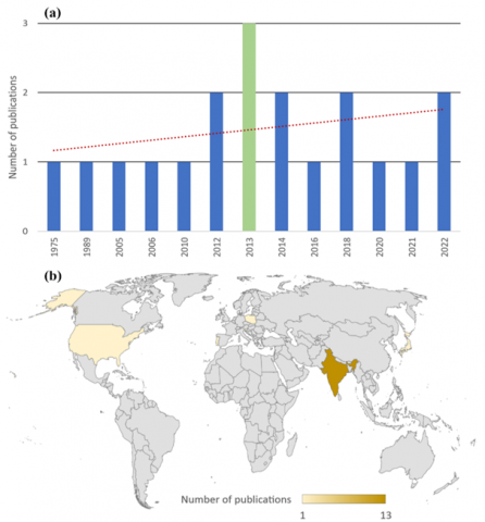 Scientific production has shown an increasing trend from 1975 to July 2023. The year 2013 marked the peak with 3 publications, making it the year with the highest number of publications (Figure 2a). The Compound Annual Growth Rate (CAGR) for scientific production between 1975 and 2022 is 6.47%. The studies are geographically concentrated, with India accounting for 13 publications (Figure 2b).