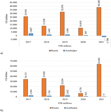 Figure 4. Inward (a) and outward (b) FDI flows in Russia and Azerbaijan (2017/2021)