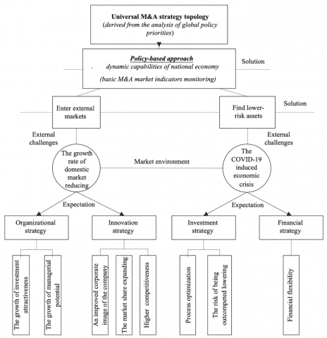 The proposed M&A strategy topology reveals the relation between four different management strategies and external challenges. For instance, organizational and innovation strategies can help businesses enter the global market, whilst investment and financial strategies enable the optimal combination of risky assets. From the managerial perspective, the proposed topology is expected to allow effective investment decisions, better management, rapid response to changes in the business environment, and economic risk forecasting. From the economic perspective, it follows the global policy priorities and takes into account the dynamic capabilities of the national economy. As of 2022, the global policy trend defining the potential usage of the proposed topology is investment retention, the process most affected by the global recession. The retention of investments, particularly during periods of economic uncertainty, can emerge as a strategic objective for both corporations and nations. Political decisions about investment support may encompass tax incentives, subsidies, streamlining bureaucratic procedures, and fostering a favourable investment climate. These measures serve as incentives for companies to devote increased attention to investment activities, including merger and acquisition transactions.