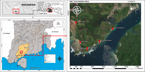 This research was conducted at community-based ecotourism sites located in East Java (Figure 1). The study focused on six observation points: Clungup Beach, Tiga Warna Beach, Gatra Beach, Sapana Sanctuary, Mini Beach, and Watu Pecah Beach within the Clungup Mangrove Conservation (CMC) Tiga Warna Ecotourism area. The selection of this specific location is driven by its unique combination of ecological significance and active community involvement in sustainable tourism practices. CMC Tiga Warna not only showcases a diverse mangrove ecosystem that attracts tourists, but it also represents a successful model of community-based ecotourism, where local stakeholders collaborate effectively to promote both environmental conservation and socio-economic development.