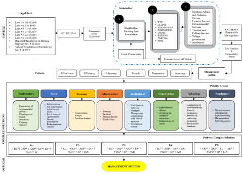The complex solutions model highlights the importance of developing a community-based ecotourism management model with a clear legal basis and involving actor grouping according to the existing social structure. The complex solutions model not only provides solutions to existing problems but also provides a framework for integrating priority actions in community-based ecotourism management while considering various sustainability dimensions. These implications indicate that the implementation of the complex solutions model can significantly contribute to improving the effectiveness of ecotourism management by promoting increased environmental moral obligation (EMO) and social influence (SI) in achieving management success. Additionally, this model illustrates a holistic and integrated approach to ecotourism management, reflecting the importance of cooperation and involvement of all stakeholders to achieve better sustainability in community-based ecotourism management, also referred to as integrated linkage.