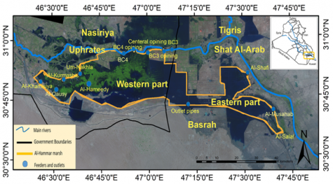 Figure 1. Location of Al-Hammar Marsh with its feeders