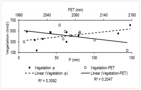 Statistical analysis was conducted to clarify the relationships between the different elements of the water budget and the influential climatic factors within the arid and semi-arid regions (inflow, precipitation, and potential evapotranspiration) with the land cover categories of Al-Hammar Marsh that resulted from the classification of spectral indicators. The statistical regression analysis was adopted by using the Excel program, Figure 7 the trend lines showed a positive impact of the inflow and precipitation on both of the open water and vegetation categories as well as the immersion areas of the marsh, offset by their negative impact on the dry areas category. At the same time, there is a negative effect of the potential evapotranspiration on the categories of open water, vegetation, and total immersion areas of the marsh with its positive impact on the dry areas category. The impact of the inflow and precipitation on the wet soil was negative as noted in the trend lines, offset by a positive impact of the potential evapotranspiration on this category, due to that the increase in the open water category led to a decrease in the wet soil category and vice versa, as shown in Table 3.