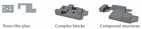 The urban pattern is also suitable for active learning schools, featuring multiple blocks within a single layout composed of flexible social spaces such as libraries and multipurpose halls, which are connected by pathways leading to classrooms. This layout is characterized by its flexibility, accommodating varying student numbers, and is commonly used in elementary schools. There are two types of this pattern: complex blocks, which can be a single-story layout with multiple blocks and integrated spaces, or a collection of complex, freely arranged, and multi-story structures (Figure 13). Studies suggest that this layout, along with the previously mentioned cluster pattern, can be adopted in elementary schools due to the gradation in the design from specific to general and the presence of small gathering spaces close to classrooms that are suitable for children [23, 24].