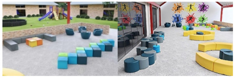 • Flexibility and Adaptability: This is represented by the ability of the layout to expand and the use of a flexible interior design that allows for easy modification and adaptation of spaces in response to active learning requirements. Additionally, flexible furniture that can be moved and rearranged according to activities is provided, along with the design of outdoor spaces that accommodate various activities.