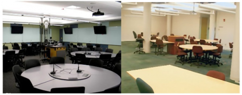 Figure 3. Replacement of original tables and chairs in right image with swivel chairs in left image to enhance personal comfort and facilitate student gatherings [14]