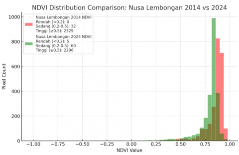 The NDVI analysis reveals crucial insights regarding tourism development impacts on mangrove ecosystems at Nusa Lembongan. Despite increasing tourism activities from 2014 to 2024, the consistently high NDVI values (2,329 to 2,296 pixels ≥0.5) demonstrate remarkable ecosystem resilience under managed tourism development. However, the emergence of low NDVI values (0 to 5 pixels <0.2) and increased moderate NDVI zones (32 to 60 pixels) suggests localized environmental pressures, potentially from tourism infrastructure development and visitor activities. This vegetation health assessment aligns with tourist perceptions documented through online reviews, where visitors note conservation successes and environmental concerns. The data supports sustainable tourism management practices while highlighting areas requiring enhanced protection measures to maintain ecosystem integrity alongside tourism growth.