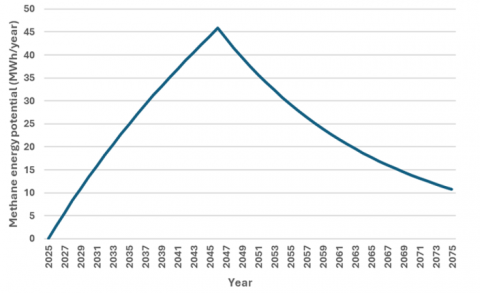 The findings indicated that the volume of municipal solid waste escalates concomitantly with population growth as indicated in Table 1. The research forecasts that by the year 2026, methane emissions derived from MSW will amount to 1,119,275 m³, continuing to increase until 2045, reaching a peak of 17,257,175 m³, after which a gradual decline is anticipated. The estimations were conducted utilising the LandGEM model (version 3.02). The year 2045 is projected as the closure year for the landfill; therefore, even in the absence of incoming waste, methane production persists.