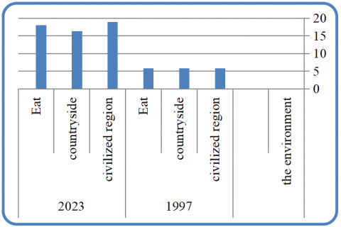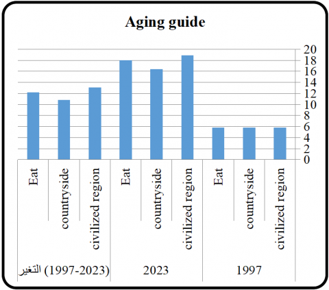 The aging index is a measure of the characteristics of the age structure. It measures the relationship between the elderly (65 years and over) and the young (0-14 years). The index is calculated by dividing the numbers of the elderly (65 years and over) by the numbers of the young (0-14). Then the result is multiplied by 100, and if the index percentage is less than 15%, the population is considered young, and if it is between 15% and 59%, the aging rate is average, but if it reaches 60% or more, the population is considered old [13]. From Figure 5 in 1997, we notice a decline in the index of urbanization, as it was (5.8) in urban and rural areas and for their combination. This percentage means that the population is young and youthful. This is due to the decrease in the percentage of elderly people (65 years and over), with an increase in the percentage of young people (0-14 years), and this leads to a decrease in the index of longevity.