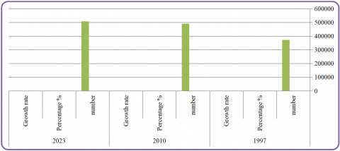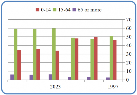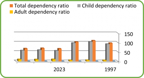 Figure 4, which represent the dependency ratio for the year 2023, shows a decline in the total dependency ratio, the dependency ratio for children, and an increase in the dependency ratio for adults compared to the year 1997. Due to a decline in the demographic weight of the proportion of young people (0-14), and an increase in the demographic weight of the proportion of middle-aged people (15-64), as well as an increase in the demographic weight of the proportion of the elderly (65 and over) out of the total size of the population.