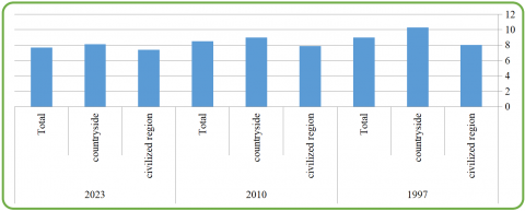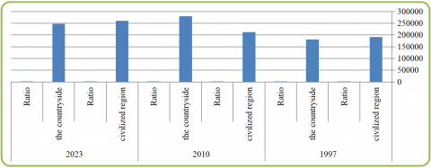 From Figure 4, the urban population reached 191,404 people in 1997, constituting 51.4% of the district's population, while the rural population constituted 48.6%, with a population of 180,748 people. In 2010, the proportion made up by the urban population decreased to 43.0%, and the proportion increased. The rural population increased to 57.0%. Despite this, the urban population increased to 211,734 people, and the rural population increased to 279,966 people. In 2023, the proportion of the urban population over the rural population increased to 51.2%, with a population of 260,019 people, while the proportion of the rural population decreased to 48.8%, with a population of 247,410 people.