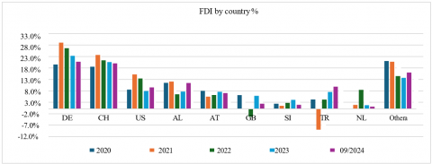 According to the Central Bank of Kosovo [12], from 2007 to September 30, 2024, total FDI inflows in Kosovo amounted to €6,897.2 million, of which equity capital accounted for €5,925.4 million and debt instruments €913.3 million. Germany and Switzerland are the main contributors to FDI in Kosovo, with each investing over €1 billion, mainly in the real estate, financial services, and energy sectors. Other sectors such as Information and Communication Technology (ICT), infrastructure, and renewable energy also show potential for future investments. Meanwhile, FDI outflows from Kosovo have also impacted the economy, reaching €1,105.4 million, with Albania as the main recipient, followed by Germany and EU countries. Additionally, portfolio investments during this period reached €3,218.6 million, of which €2,427.6 million were in equity and investment fund shares, while €791 million were in debt instruments. In 2023 alone, Kosovo's net FDI inflows reached €816 million, marking an increase compared to the previous year [12].