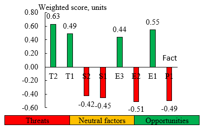 Having analyzed these factors, we can conclude that the internal environment is generally favorable, although the influence of weak factors is expressed (the final weighted assessment has a positive value of +0.09). This means that the strategy should be aimed at building on the strengths and eliminating the influence of weak factors.