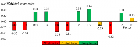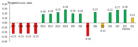 For this purpose, the most significant factors are highlighted (modulus weighted score is greater than the average (0.21 units).