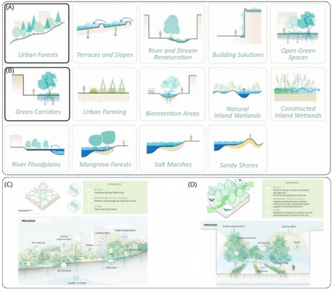 Figure 10. Example of interventions to integrate nature-based solutions to strengthen connectivity in Ouagadougou: (A) and (B) represent NbS family (urban forests & green corridors) respectively; (C) and (D) are graphic representations