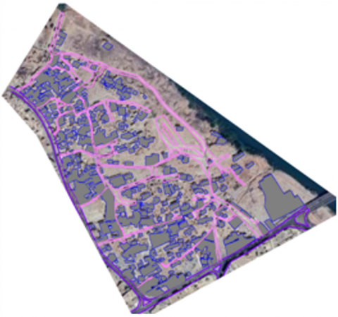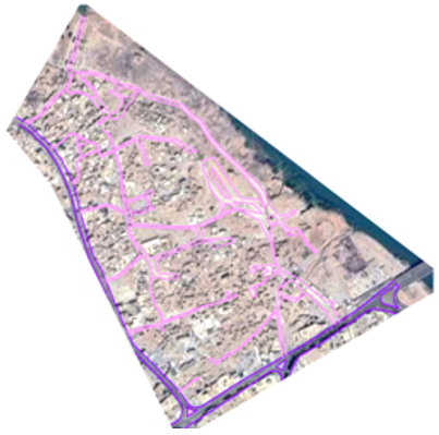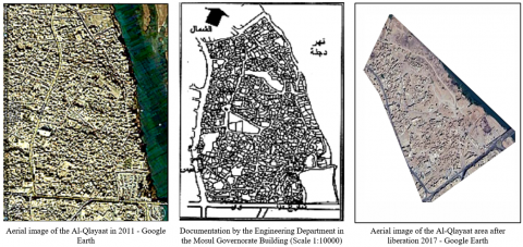 Aerial photographs are collected and the situation before and after the war is analysed using GPS (Figure 3). Aerial photographs of the urban fabric of the Al-Qalya’at neighbourhood were installed to assess the current state of the area after the destruction, comparing it to its pre-war condition. This data contributes to accurately documenting the current situation.