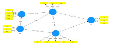 Based on the theoretical foundations and the empirical evidence discussed in the preceding literature review, this study proposes a conceptual model to investigate the factors influencing CL in the context of purchasing green products via e-commerce platforms in Vietnam. Figure 1 visually depicts this proposed research framework, illustrating the hypothesized relationships among the core constructs: WP, ENJ, CT, CS, and CL.