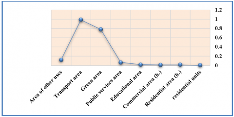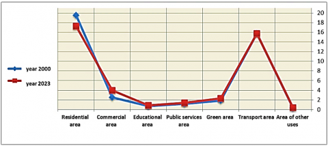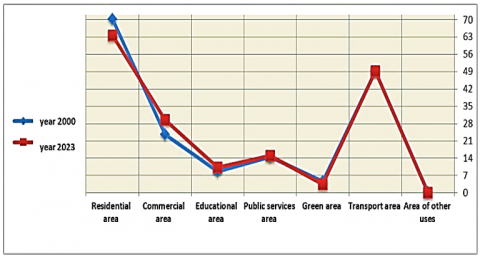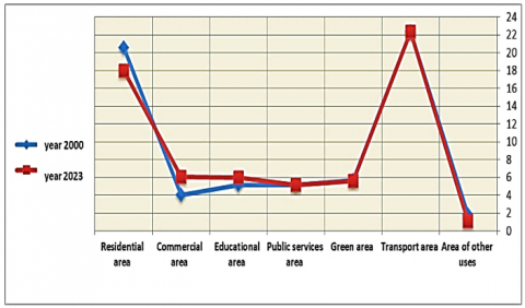 It is one of Najaf's more contemporary neighbourhoods. Incredible urbanization has occurred there over the last several decades (Figures 2 and 3). The district stands out due to its advantageous location, which is close to several key regions and important government and service organizations. The district is well thought-out, having a landscape with a variety of residential blocks, commercial areas, educational institutions, parks, and public amenities. This particular locality embodies the modern growth of Najaf. Najaf is a well-established city with transportation, health, education, and entertainment infrastructure that can sustain the demands of its citizens [26]. This particular sector, combining residential and service aspects, has seen much development lately after being the subject of many investment projects and commercial developments. Educational institutions here include the College of Administration and Economics, as well as entertainment areas such as Al-Furat Family Park. This comes together as a unified environment capable of meeting all community needs. Thanks to its well-planned neighbourhoods, modern infrastructure, and proximity to Najaf's main hubs, Al-Furat District has quickly developed into a prime attraction for buy-to-let owners. Comparing the 2000 map with the 2023 map and Table 1, therefore, indicates that business use has increased, especially along major roads. The area witnessed the development of more amenities in 2023, along with transit facilities for the events of a public or religious character. A change has also occurred in the apartment building re-sorting method. Figure 4 displays the sharply increased growth of green spaces and recreation places. Thus, it is estimated that the re-sorting rate in this area stood at about 29.63% for the period of 2000-2023, as shown in Figures 5 and 6.