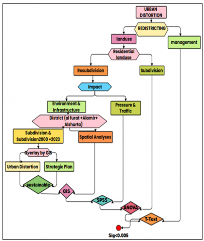 This study investigated the impact of residential land redistribution on urban growth. It also examined population density management in Najaf by comparing Al-Furat, Al-Amir, and Al-Shurta areas. The study lasted from 2000 to 2023. Resubdivision methods were examined to determine how they addressed population growth demands and enhanced residential land use distribution. It also explored the planning, social, and economic issues that changed these areas' urban landscapes. Based on the geographical analysis of maps from the investigated years, re-subdivision improved land usage and public services, notably in the Al-Furat and Amir areas. Significant resubdivision rates were 29.63% and 31.58%. Meanwhile, Al-Shurta had little change. Its unique location and residential purpose raised it to 2.75%. The data also showed a definite urban tendency to convert open areas into residential and commercial units, and to alter land use patterns to meet population demands. Spatial analysis was performed using Geographic Information Systems (GIS) and the statistical software SPSS 29. After conducting T-test and ANOVA analysis, significant differences were found for most uses, including residential, which is the focus of our research. The analysis revealed the percentage of urban distortion resulting from residential redevelopment, pressure on services, and the housing ratio. These percentages were achieved at levels less than 0.05, reaching 0.001 and 0.009. They were graded from 2000 to 2023, the periods used for comparison and analysis. This highlights the importance of re-subdividing in urban management and enhancing quality of life. The research concluded that re-subdivision can improve urban fabric if accompanied by a balanced planning framework that considers environmental conservation and provides adequate infrastructure to meet future population growth.