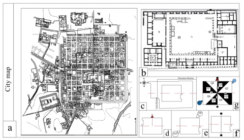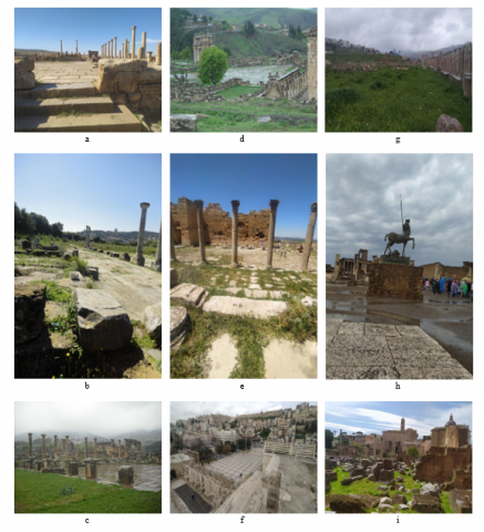 Figure 1. Pictures of Roman forums: a. Timgad forum; b. Hippo regius forum; c. Djemila forum (01); d. Djemila forum (02); e. Madauros; f. Philadelphia (Amman) forum; g. Gerasa forum (probable location [7]); h. Pompeii forum; i. The forum of Rome