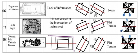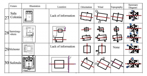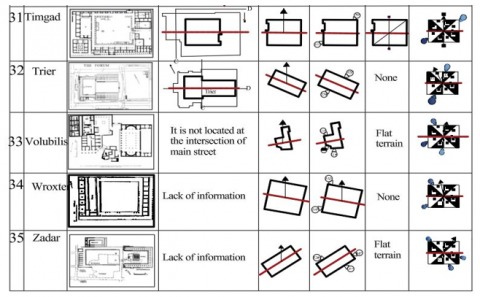 This research work aims to know how the Roman builders undertook such adaptation in respect of the various constraints specific to the different contexts included in the Roman Empire. Consequently, and as a first step, several cases of forums in North African and European cities were selected as a study corpus. The undertaken analysis considers the specific climatic and topographical constraints of the places where the study corpus objects are located. The geometric layout of the forum (longitudinal and transversal axis) is examined in relation to the slope of the terrain, as well as the prevailing wind direction and the path of the sun, both individually and in combination. This made it possible to define a set of categories of forums that totally or partially share these examined characteristics.